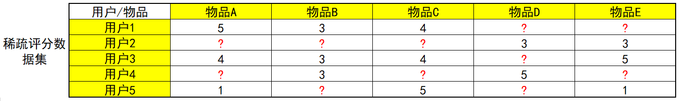 用户-物品的评分矩阵,根据评分矩阵的稀疏程度会有不同的解决方案